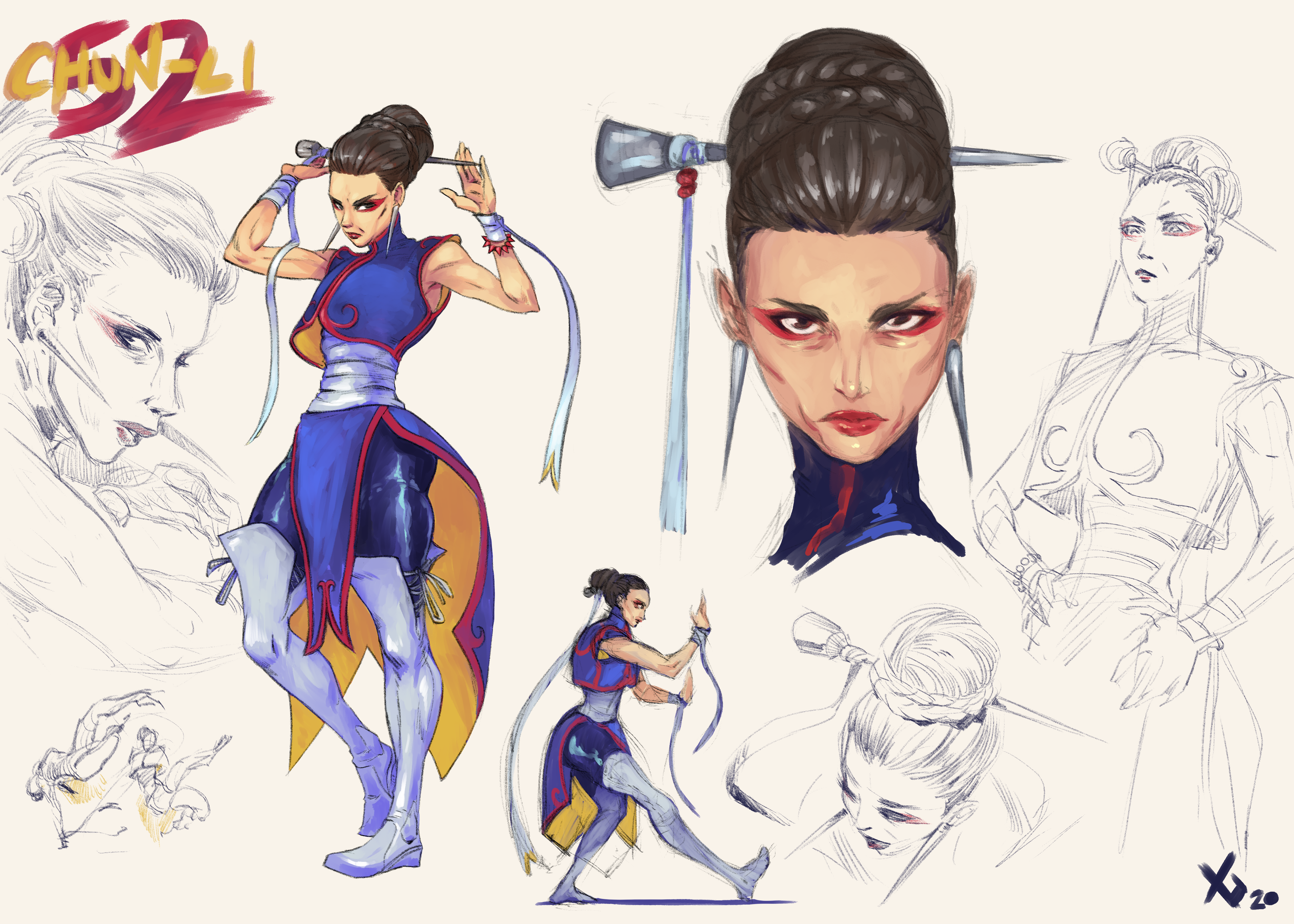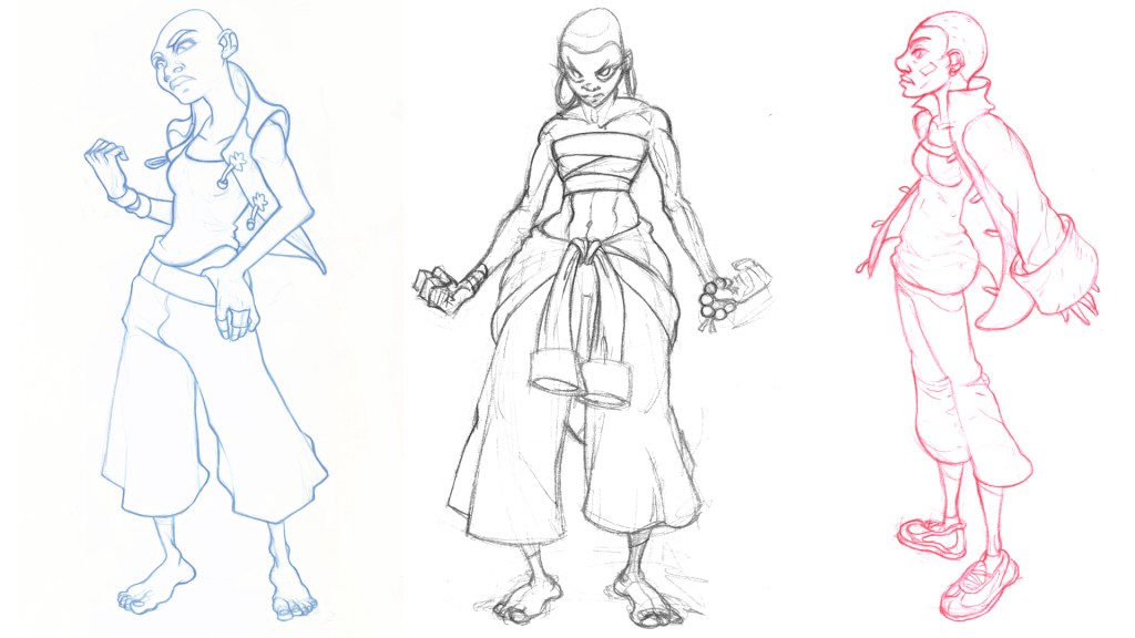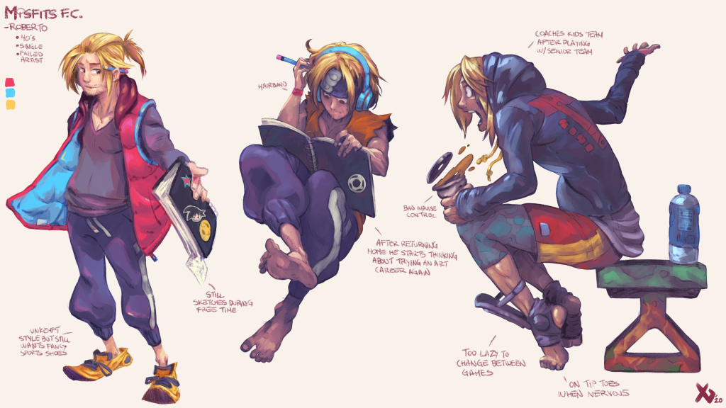 The cast is slowly coming together, the studies below start showing the level of refinement I want, as characters grow in complexity the importance of shape language increases. Each player should have a distinct style and sense of fashion that gives you insight not just on their personality but their style of play as well.